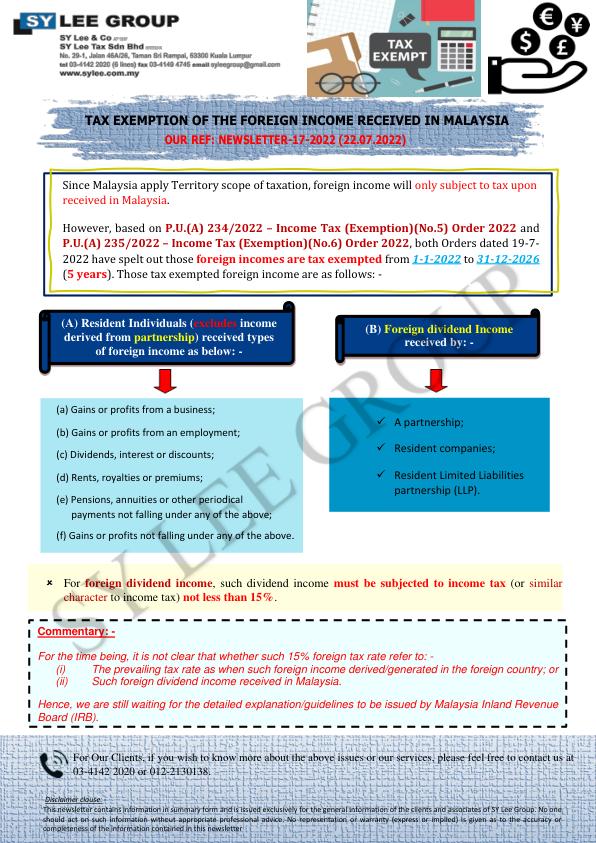 Newsletter-17-2022 - Tax Exemption of the Foreign Income Received in Malaysia